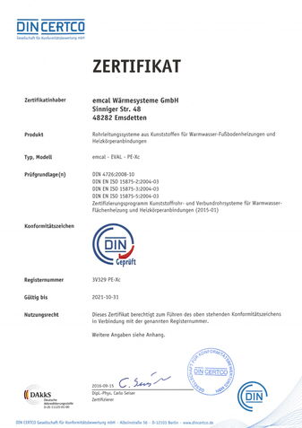 Alle emcal Flächenheizsysteme werden ständigen Qualitätskontrollen unterzogen und weisen höchste Fertigungsstandards auf. emcal gibt daher auf alle Flächenheissysteme 10 Jahre Garantie. Sämtliche Systeme und Rohre werden jährlich überwacht und sind DINCERTCO zertifiziert. Die dafür notwendigen Prüfungen werden durch anerkannte Institutionen vorgenommen.